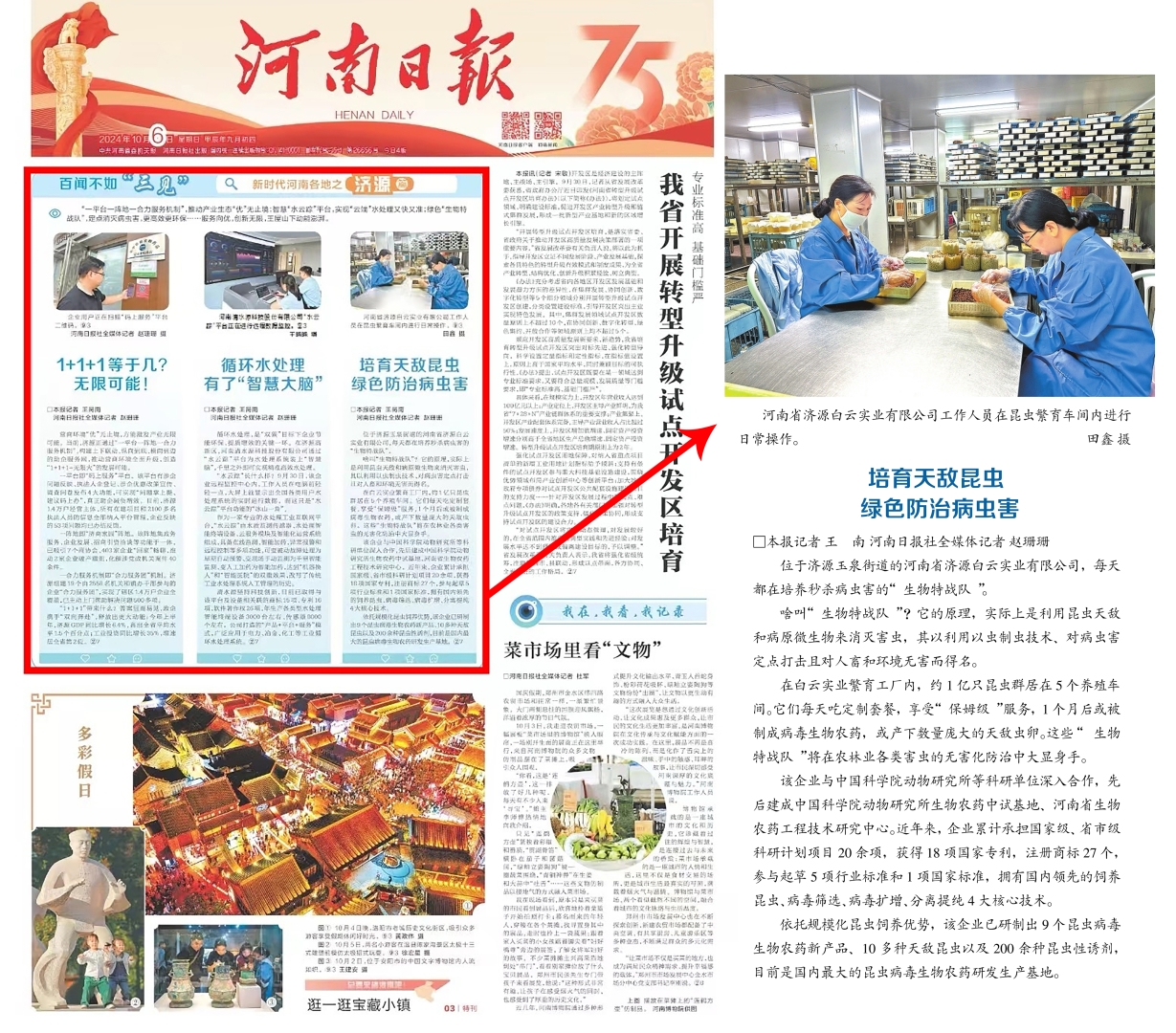10月6日,河南日報(bào)以《培育天敵昆蟲綠色防治病蟲害》為題,在頭版報(bào)道了河南省濟(jì)源白云實(shí)業(yè)有限公司養(yǎng)蟲治蟲、精研覃思,高水平生產(chǎn)研發(fā)綠色“生物特戰(zhàn)隊(duì)”,定點(diǎn)消滅病蟲害,使農(nóng)林業(yè)各類病蟲害的無害化防治更專業(yè)更高效更環(huán)保。